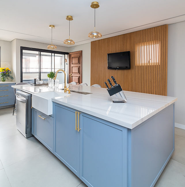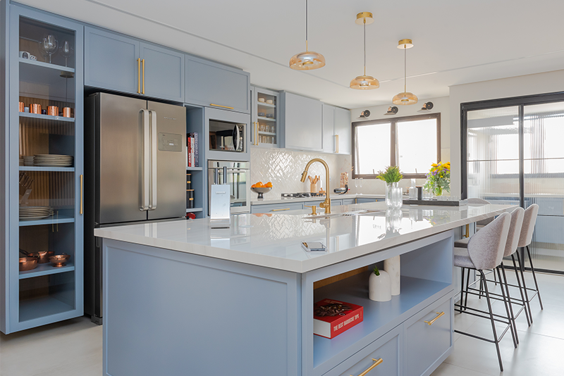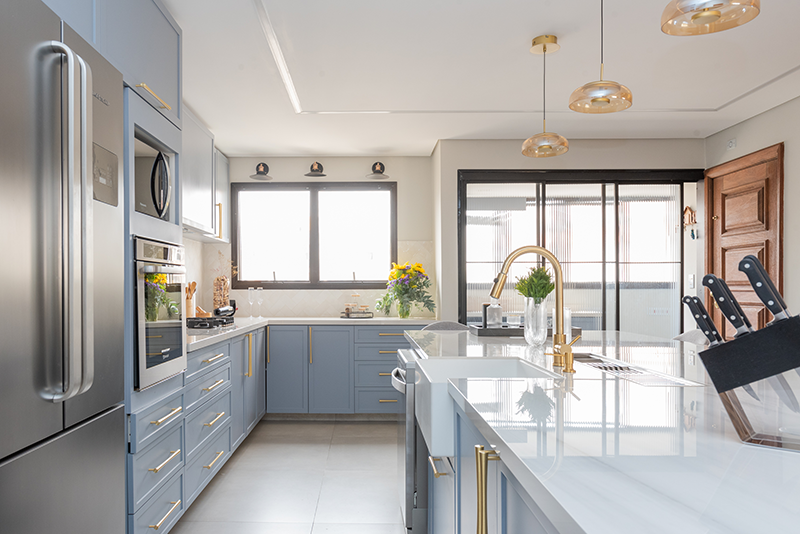 Projeto Mari Milani| Cozinha ampla com ilha central e marcenaria em azul claro. A área de serviço fica integrada, mas discreta, graças à porta de serralheria com vidro canelado, garantindo luz natural e organização.