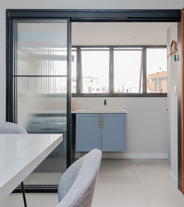 Mas isso não quer dizer que os dois ambientes precisam ter o acesso completamente aberto: seja pela interferência de odores dos pratos preparados e que podem impregnar nas roupas penduradas no varal ou mesmo pelo desejo de não deixar a área de serviço exposta para todos, a arquiteta Mari Milani conhece de perto essa missão propiciar discrição em ambientes tão próximos, mas com vida própria. “Mesmo realizando um fechamento, não excluímos a praticidade que é executar as tarefas domésticas entre os dois espaços”, explica.