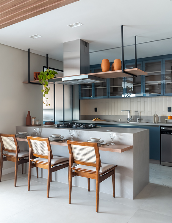O ponto de partida é definir a opção que irá compartimentar a cozinha e área de serviço, que pode ser feita em serralheria e fechamento de vidro e madeira, por exemplo, considerando as portas em tipologias que melhor atendam o projeto como as mimetizadas, de correr ou de folhas. Nesse entendimento, a profissional ainda coloca como observação a necessidade de ventilação e luz natural para a área de cocção e preparo dos alimentos. “Caso esses fatores estejam dispostos apenas na área de serviço, precisamos pensar em alternativas que ofereçam esses atributos também para a cozinha”, indica.