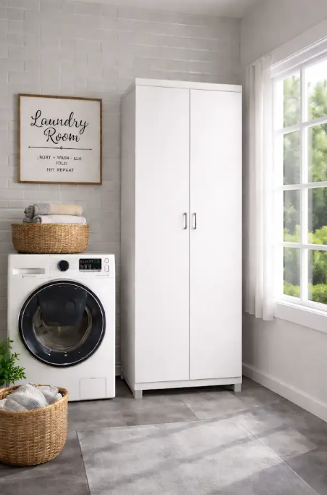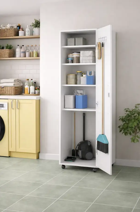 Nesse ambiente, modelos com nichos, ganchos laterais e suporte para tábua de passar são ideais. Para espaços reduzidos, um armário de uma porta com prateleiras internas já dá conta do recado. Aposte em versões com chave quando houver produtos químicos para guardar com mais segurança.