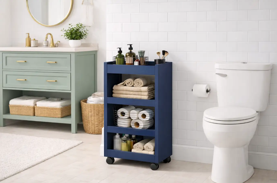 Sem armário embutido, o banheiro vira rapidamente um espaço desorganizado. O armário multiuso resolve esse problema, afinal, guarda toalhas, produtos de higiene e medicamentos. O modelo baixo ou com rodinhas se adapta bem a espaços pequenos, e o modelo com chave é a melhor opção para manter medicamentos fora do alcance de crianças.