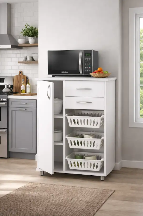 - baixo: versátil, serve de apoio para micro-ondas, cantinho do café ou fruteira, além de acomodar panelas e assadeiras;