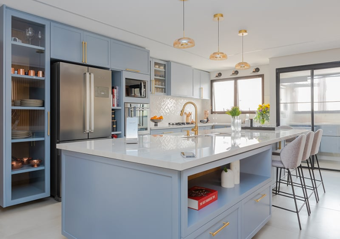 Armários e paredes em azul pastel trazem charme para a cozinha e, dependendo do design, podem criar um ar retrô ou moderno.