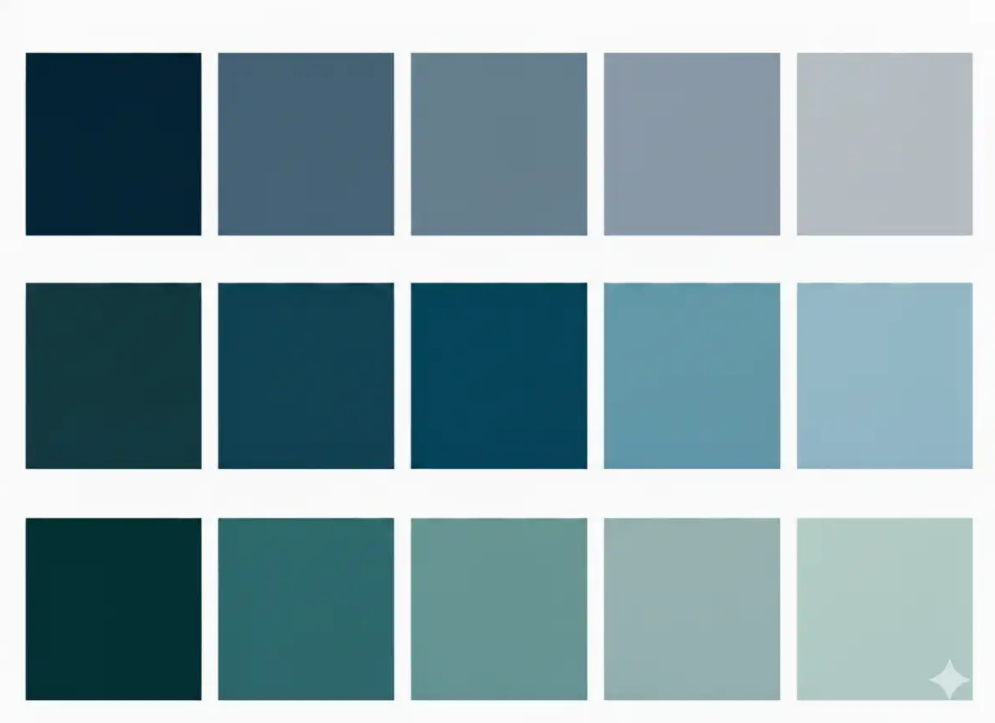 O azul petróleo não se resume a uma cor só. A paleta abrange desde versões claras com nuances esverdeadas até tonalidades profundas e quase noturnas. Cada variação carrega uma intensidade distinta e provoca sensações diferentes no ambiente.