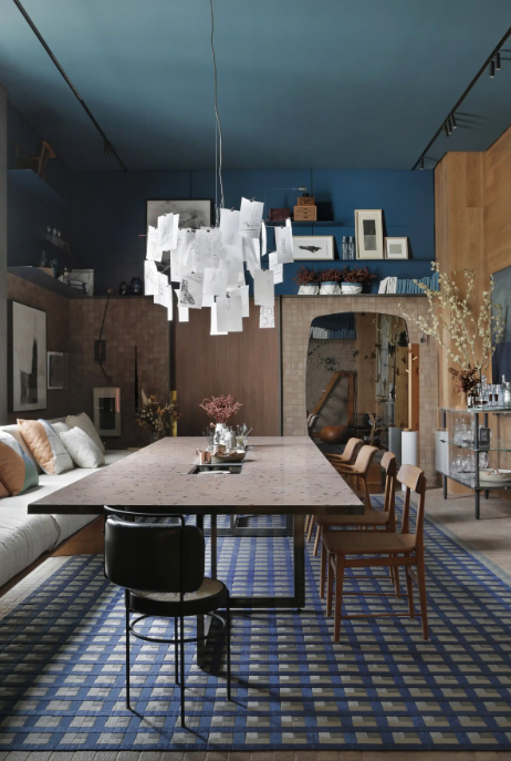 Na sala de jantar, o azul petróleo aparece com elegância em cadeiras estofadas, na mesa ou em um pendente sobre ela. Esses elementos concentram a atenção no centro do ambiente, que é justamente o ponto de convívio.