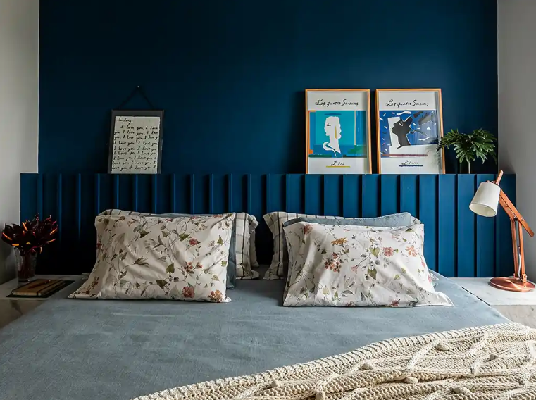 O quarto pede cores que favoreçam o descanso, e o azul petróleo cumpre esse papel com eficiência. Considerando isso, prefira tons mais suaves na parede da cabeceira para criar um ponto focal tranquilo sem escurecer demais o cômodo.