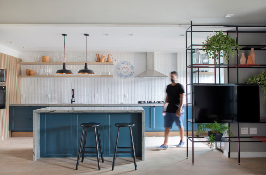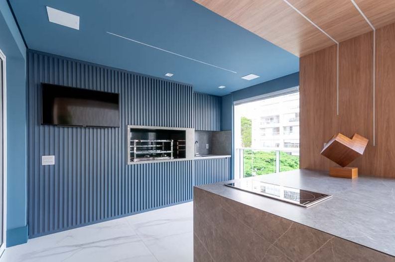Banquetas altas, pendentes e até a churrasqueira revestida com pastilhas em azul petróleo são formas de aplicar a cor com personalidade. Como o espaço gourmet geralmente tem integração com a área externa, considere a entrada de luz natural na escolha do tom.