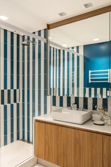 No banheiro, o azul petróleo remete à água e transmite frescor. Revestimentos cerâmicos, pastilhas e até a pintura da parede do box são formas de inserir a cor sem exagero nesse ambiente.