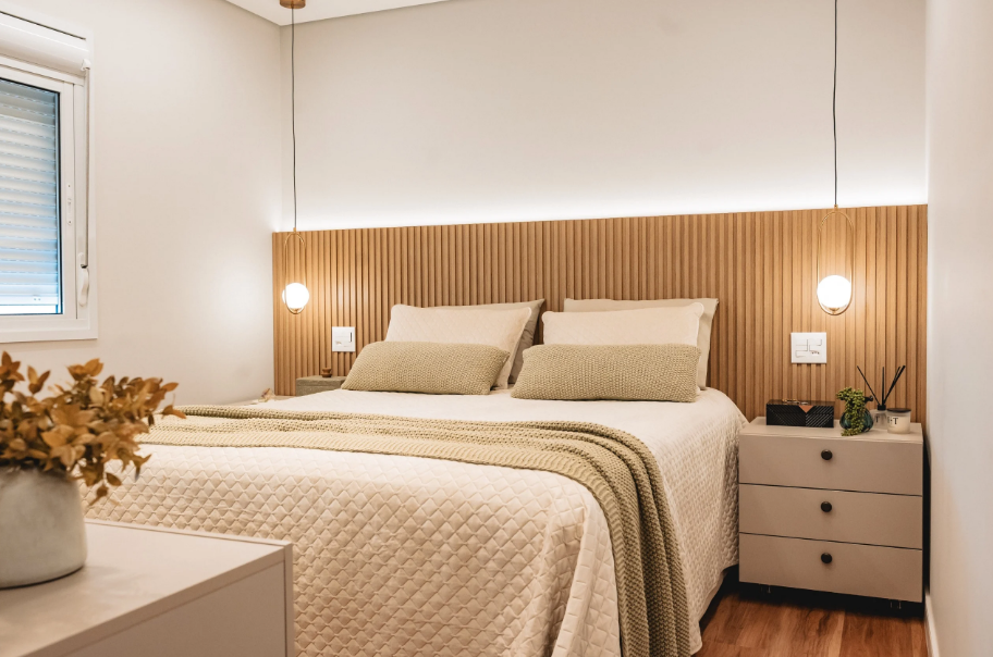 Tons suaves como off-white, palha e bege claro são ótimos para o quarto porque criam uma atmosfera de descanso sem deixar o espaço com cara de vazio. Para quartos pequenos, detalhes espelhados e metalizados ampliam a percepção do ambiente sem quebrar a paleta.