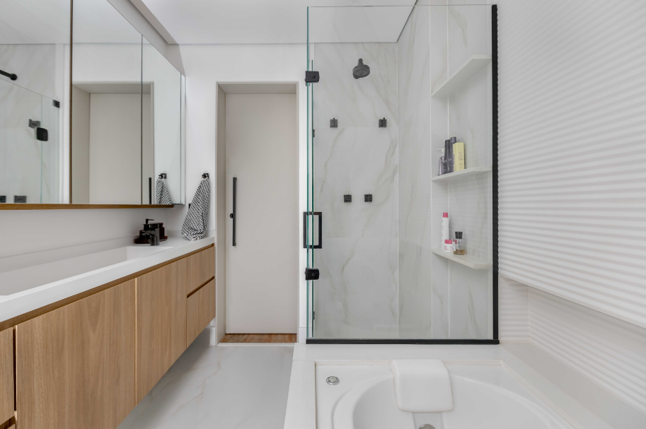 No banheiro, cores neutras em revestimentos e louças criam um visual limpo e atemporal. Branco, off-white, cinza e bege são os tons mais comuns nesse espaço, e não é por acaso, afinal, eles combinam com metais, madeira e diferentes estilos de projetos.