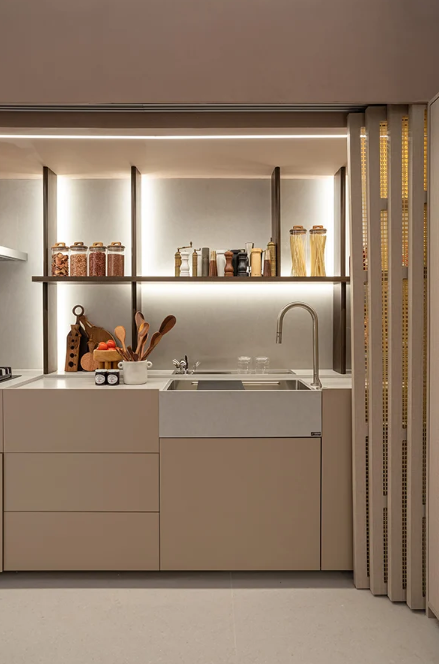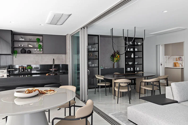 Na cozinha, o cinza é uma das cores neutras mais inteligentes para o balcão porque disfarça marcas com muito mais eficiência do que cores claras. Armários de madeira natural complementam essa base e trazem calor ao espaço.