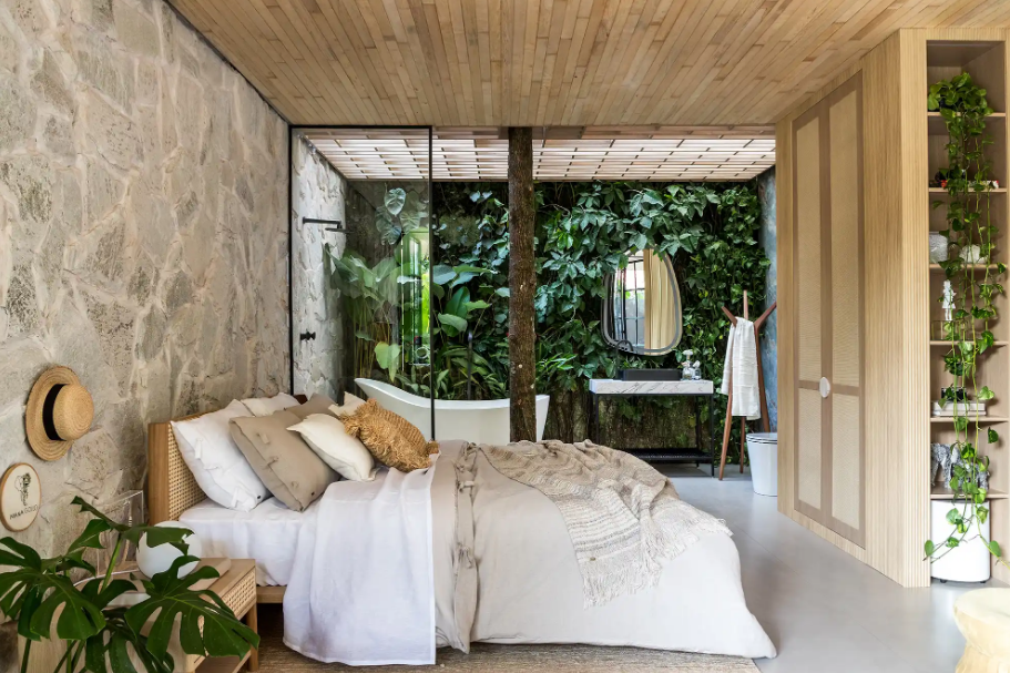 - texturas: linho, couro, madeira e pedra criam contraste natural entre si. Cada material reflete a luz de um jeito diferente, e essa variação mantém o ambiente com vida;