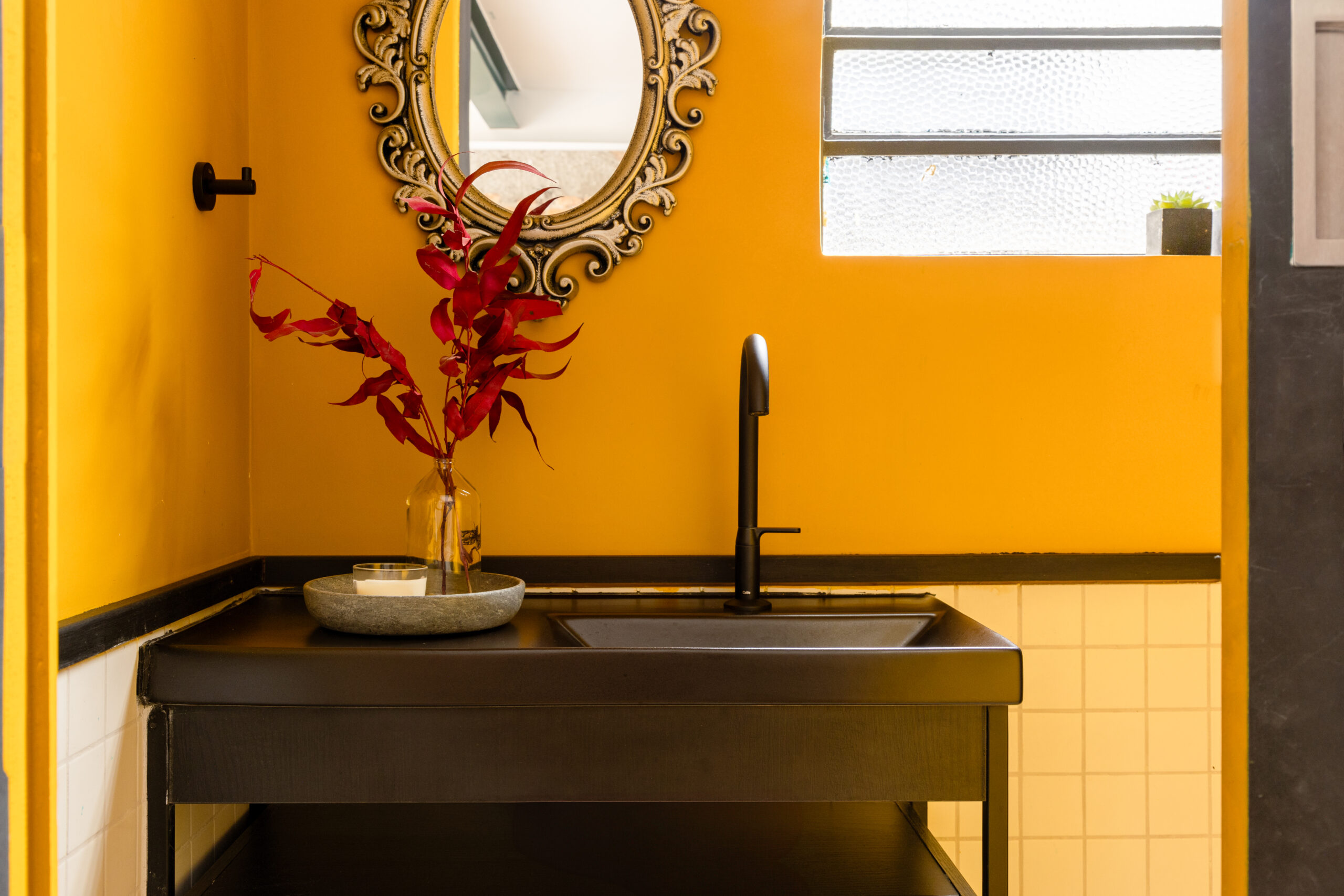 Leila Viegas Composição de amarelo terroso com preto e branco criam o cenário atemporal para o lavabo – projeto Cambuci Arquitetos