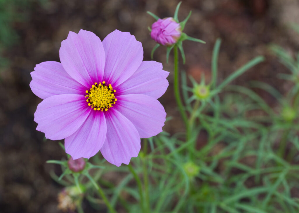 Resistente à seca e de baixa manutenção, o cosmos se ressemeia naturalmente e garante floração contínua a cada ciclo. Suas hastes altas balançam com a brisa e criam movimento no canteiro, um efeito difícil de reproduzir com outras espécies.