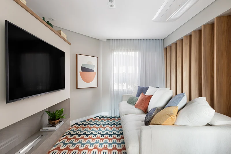 Outro ponto forte está na praticidade. O painel pode incluir nichos e prateleiras embutidos, ou receber módulos, para acomodar aparelhos e controles. Com menos peças soltas no chão e menos cabos aparentes, a limpeza fica mais simples.