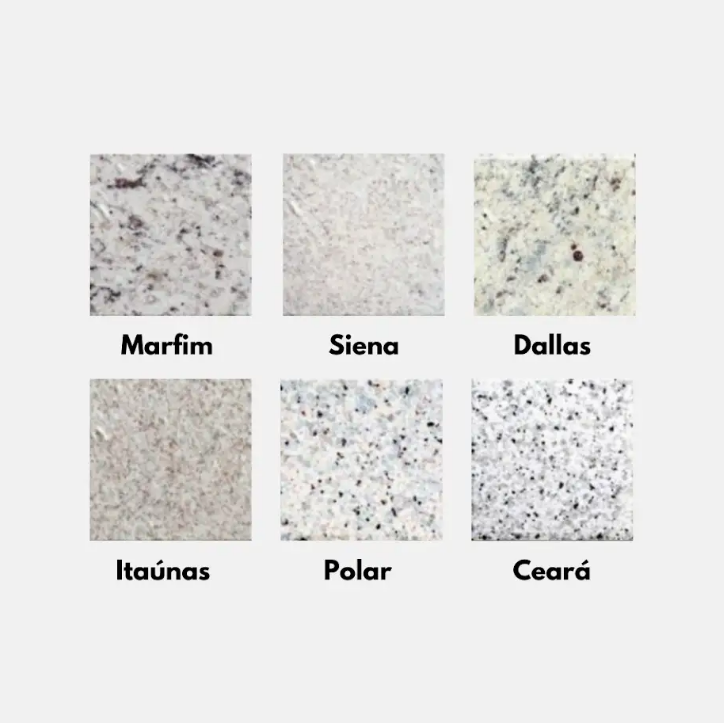 - granito branco marfim: fundo claro com tons de bege ou amarelado, resistente e indicado para pisos internos;