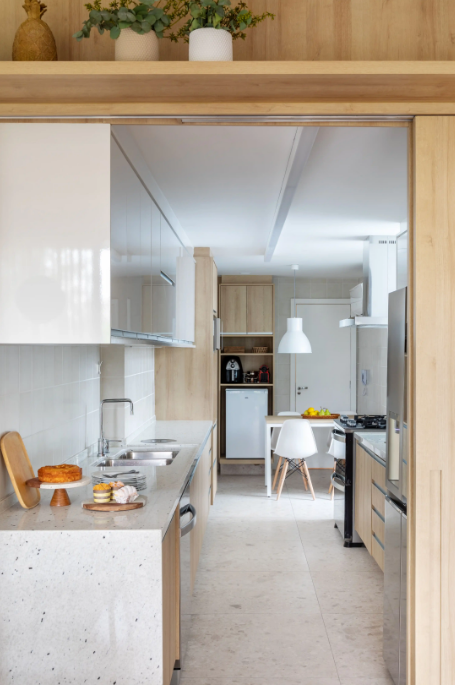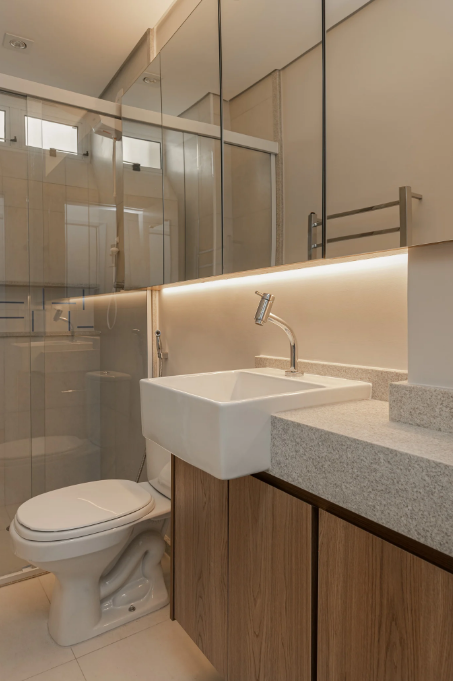 Revestimentos claros ajudam a ampliar visualmente os cômodos, algo essencial em espaços compactos como banheiros, lavabos e cozinhas. A tonalidade neutra ainda transmite organização e leveza ao ambiente.