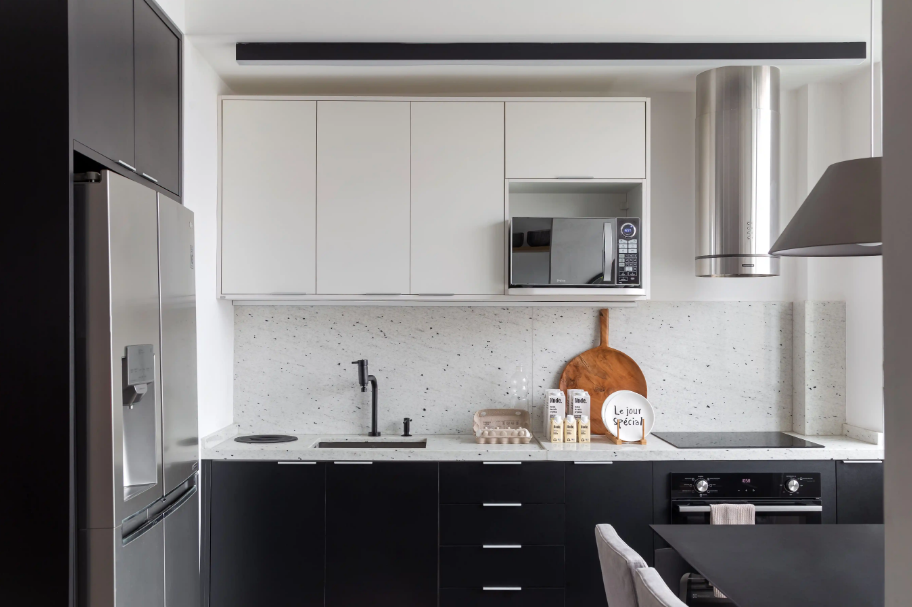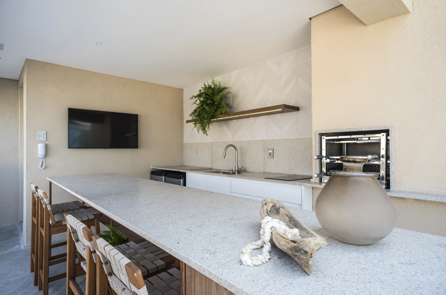 Essa pedra pode ser aplicada em diversos ambientes e superfícies da casa. Na cozinha, ela aparece com frequência em bancadas e ilhas, já que resiste bem ao calor, a riscos e ao contato com alimentos.
