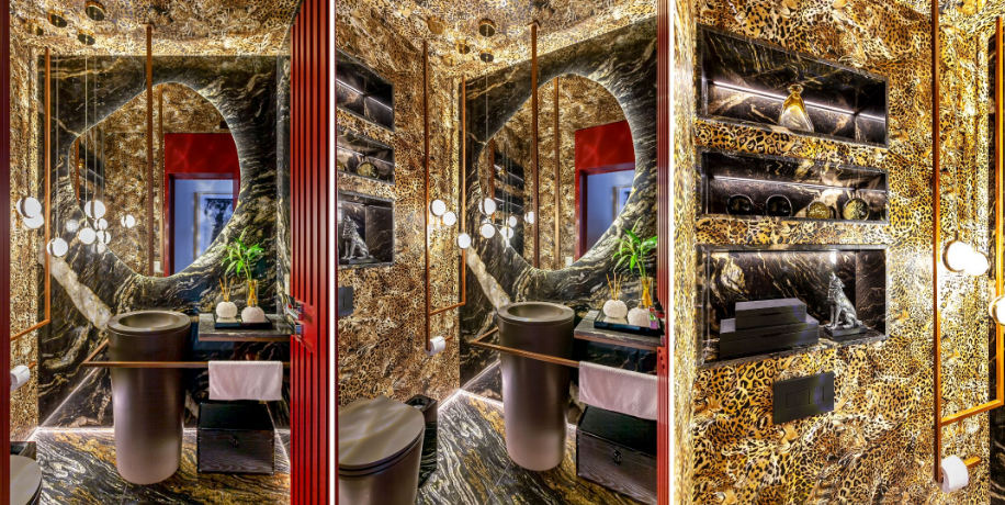 Fascínio, ousadia e contraste. É com esse trio que o projeto se destaca ao combinar superfícies espelhadas com o dramatismo de um papel de parede em animal print. “Mesmo com as dimensões reduzidas, típicas de um lavabo, optamos por uma cuba de piso em louça da Deca e uma torneira de teto para maximizar o espaço e causar impacto”, explica Cristiane. Os pendentes iluminam suavemente, enquanto o revestimento marmorizado presente no piso, na bancada, nos nichos e na parede onde está o espelho orgânico entrega continuidade e profundidade visual.
