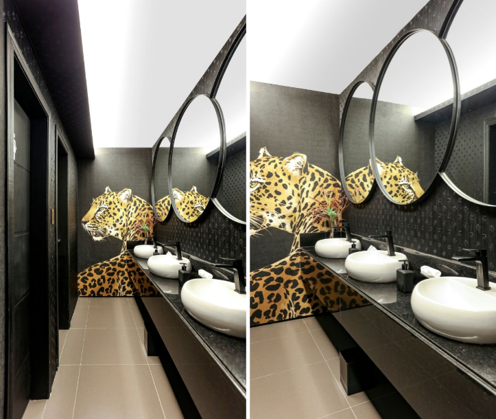 Na parede, o papel com assinatura Dolce & Gabbana provoca magnetismo instantâneo ao espaço executado pela profissional. “Tudo foi pensado para impressionar, desde a destemor de apostar em revestimentos e metais escuros, até os papéis com estampas impactantes que transformam o ambiente em uma verdadeira obra de arte”, afirma. A base escura e os espelhos circulares equilibram o décor, deixando a protagonista onça-pintada brilhar com todo exagero merecido.