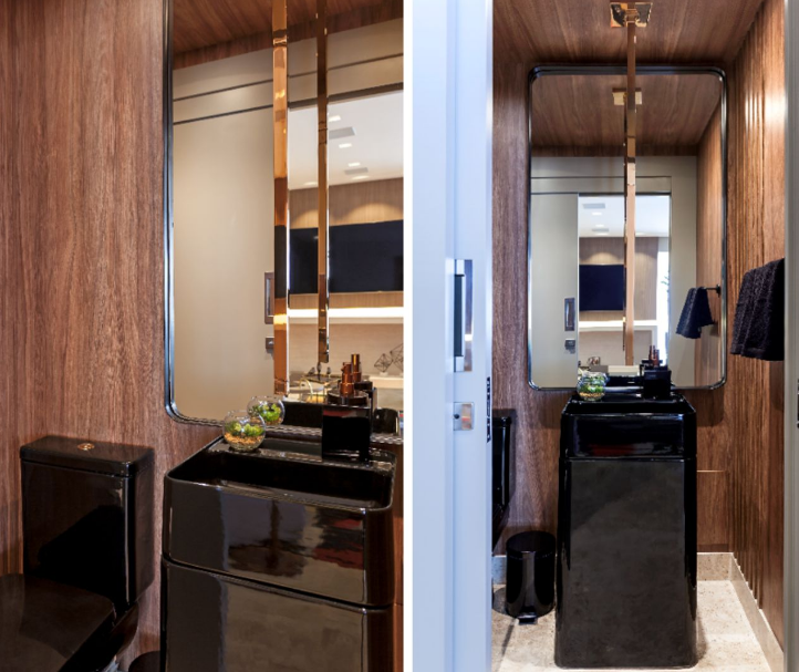 No primeiro, a cuba suspensa de madeira foi esculpida à mão com o reaproveitamento de material e leva assinatura da designer Mônica Cintra. Ela aparece dentro de uma atmosfera requintada, com paredes e teto revestidos de porcelanato marmorizado escuro.