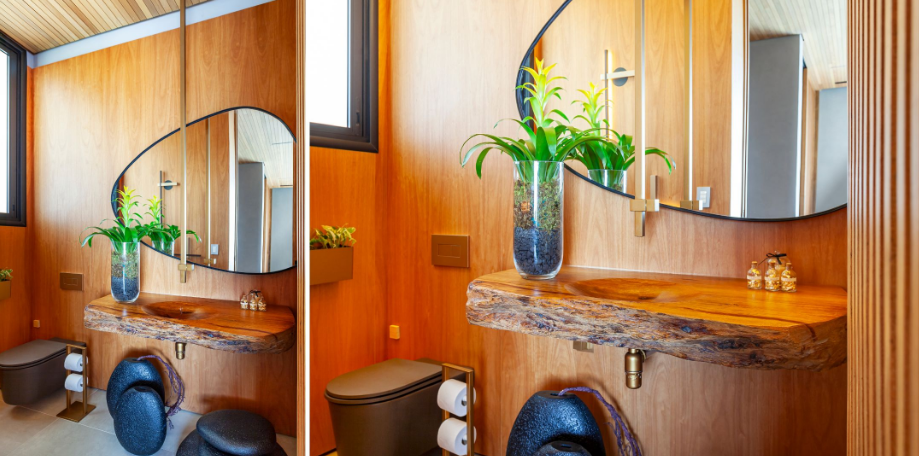 Aqui, o natural não é apenas uma escolha estética, mas sim o conceito inteiro do projeto. Cristiane resgatou a organicidade da madeira bruta e transformou o tronco em uma bancada escultórica. “Esse é o lavabo que atende toda a área social de uma grande residência que projetei em Itu e aqui nos permitirmos ir muito além. A natureza é a estrela”, revela. A organicidade do espelho e o uso da torneira de teto equilibram rusticidade e contemporaneidade.