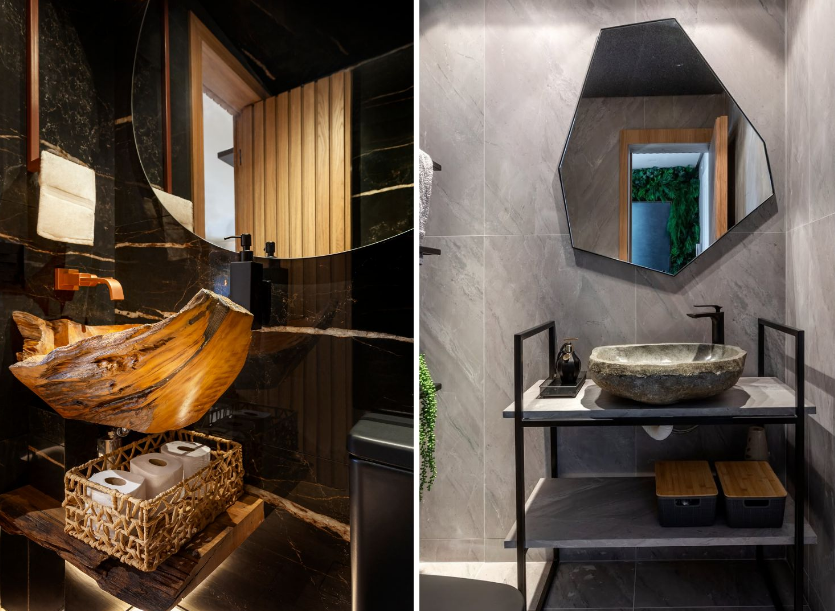 Entre os elementos que transformam um lavabo em ponto de destaque, as cubas são, sem dúvida, peças-chave. Em dois projetos distintos, Cristiane apostou em materiais naturais e volumetrias expressivas para surpreender.