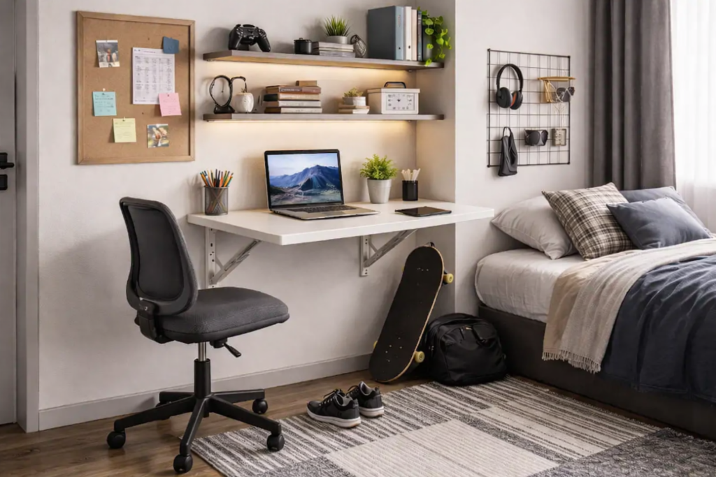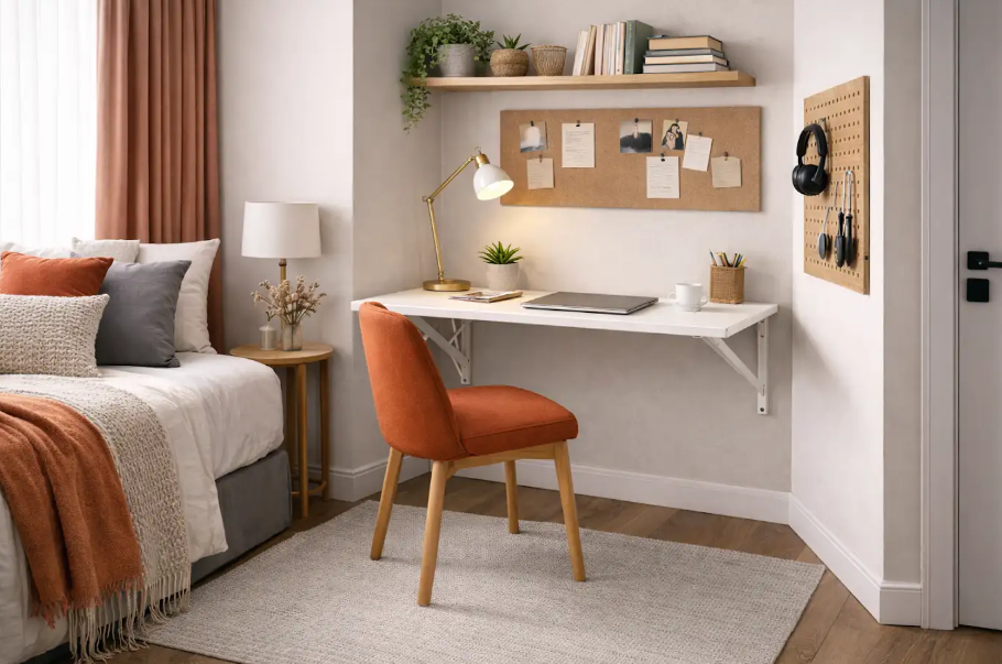 No quarto, esse móvel ajuda a montar uma área de estudo ou trabalho sem ocupar espaço de forma permanente. Isso faz diferença em ambientes menores, onde uma escrivaninha tradicional pode deixar o layout mais apertado do que o ideal.