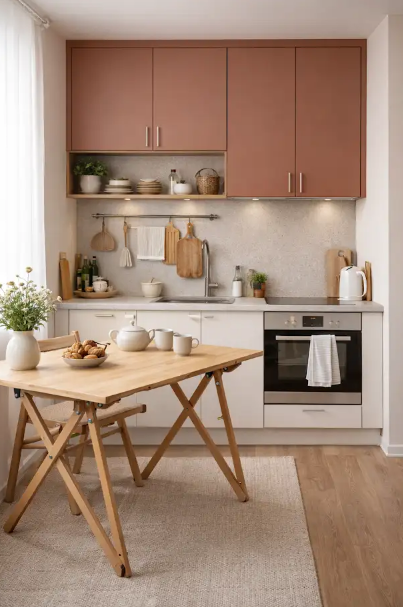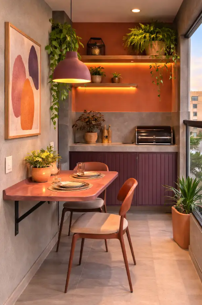 Espaços compactos pedem soluções inteligentes, e a mesa dobrável é uma delas – Foto: AI generativa