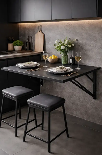 A mesa dobrável é um móvel projetado para ocupar o mínimo de espaço possível quando não está em uso. Existem dois tipos principais: o modelo de piso, com pernas articuladas que se recolhem sob o tampo, e o modelo fixo diretamente na parede.
