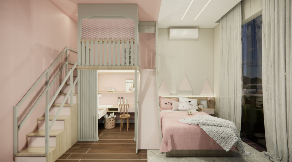Tudo depende do espaço disponível e da rotina da casa. Famílias com irmãos no mesmo quarto, por exemplo, usam o mezanino como cama extra, com espaço para solteiro ou beliche. Já quem trabalha em casa consegue um home office mais reservado. A lista de possibilidades não para por aí. O mezanino de madeira pode ser: