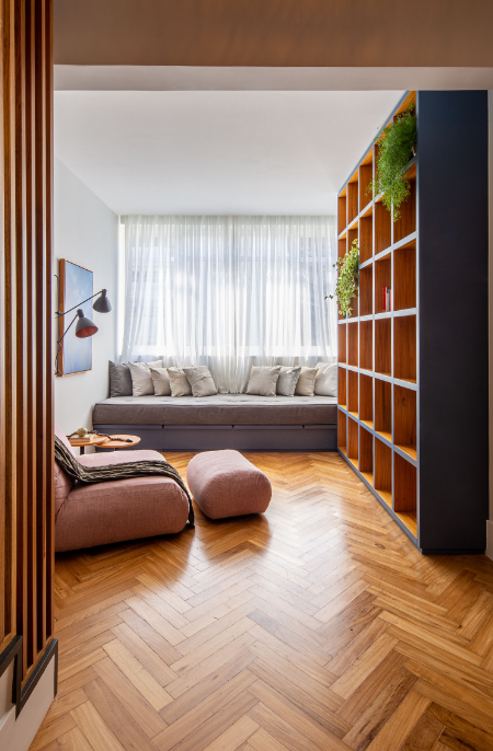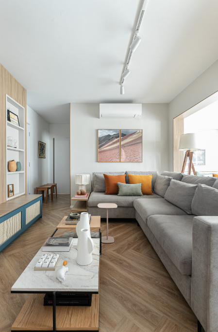 Porcelanatos com efeito madeira e piso vinílico colado são boas pedidas para esse padrão na sala. Os dois reproduzem as variações do material natural e, com a mistura de tons claros e escuros, garantem movimento, elegância e um visual moderno e contemporâneo.