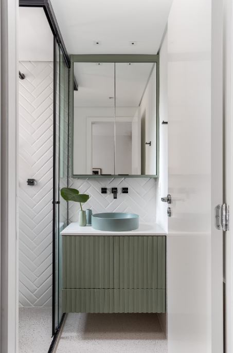 No banheiro, o padrão pode ir para o piso ou para a parede com porcelanatos retangulares ou cerâmicas de formato alongado. Se você prefere um visual mais clássico, a aposta é combinar duas cores que se harmonizam, como branco com verde ou branco com cinza.