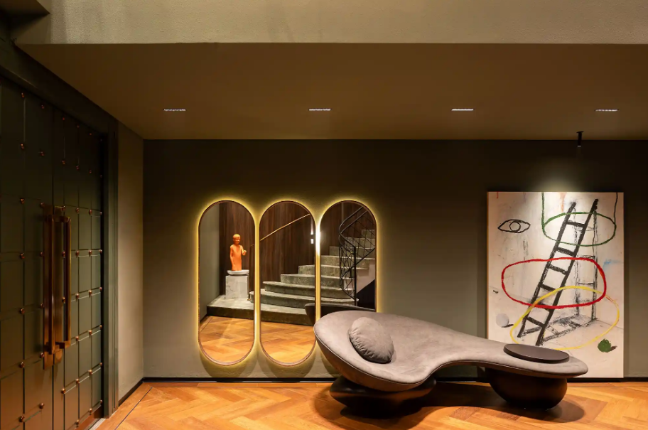 No corredor e no hall de entrada, a espinha de peixe cria um efeito direcional que valoriza o comprimento do espaço. Porcelanatos retangulares, tacos de madeira ou cerâmicas em tons neutros são os materiais mais indicados, pois suportam bem o tráfego intenso e têm boa durabilidade.