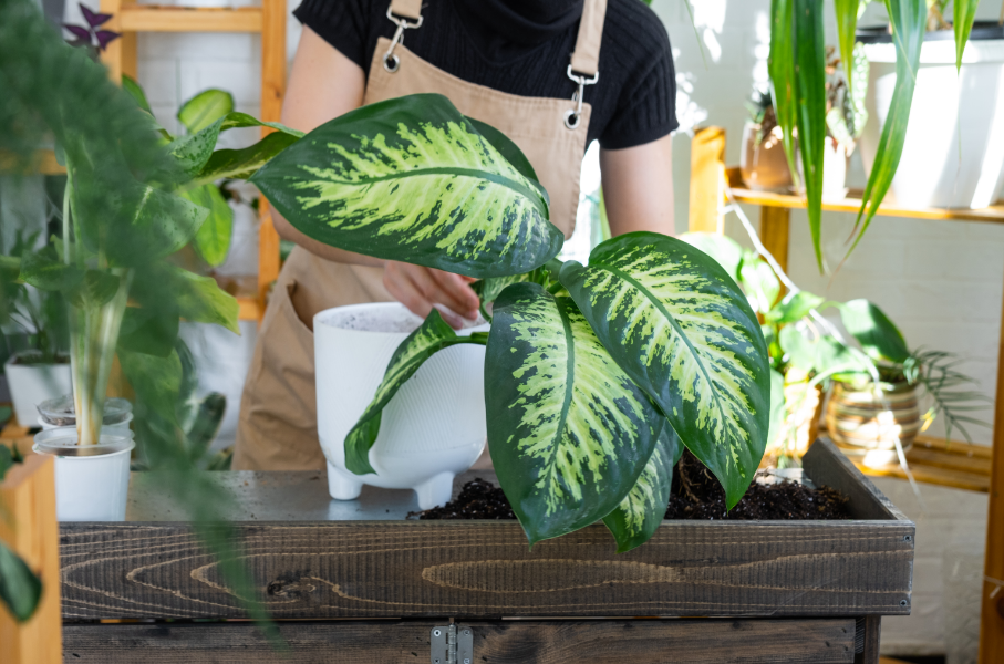 Muito popular, a comigo-ninguém-pode se adapta a locais com pouca luz e necessita de regas moderadas. É uma boa escolha para quem quer uma planta bonita e resistente sem exigir tantos cuidados. Como acontece com a aglaonema, a toxicidade exige atenção em casas com crianças e animais.