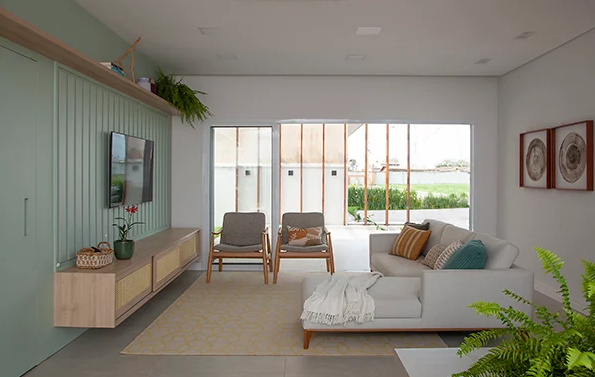 A porta de vidro de correr para sala também é bonita para colocar de acesso a varanda ou jardim. O vidro permite a entrada de luz abundante em casa, deixando sua sala bem iluminada e aconchegante durante o dia.