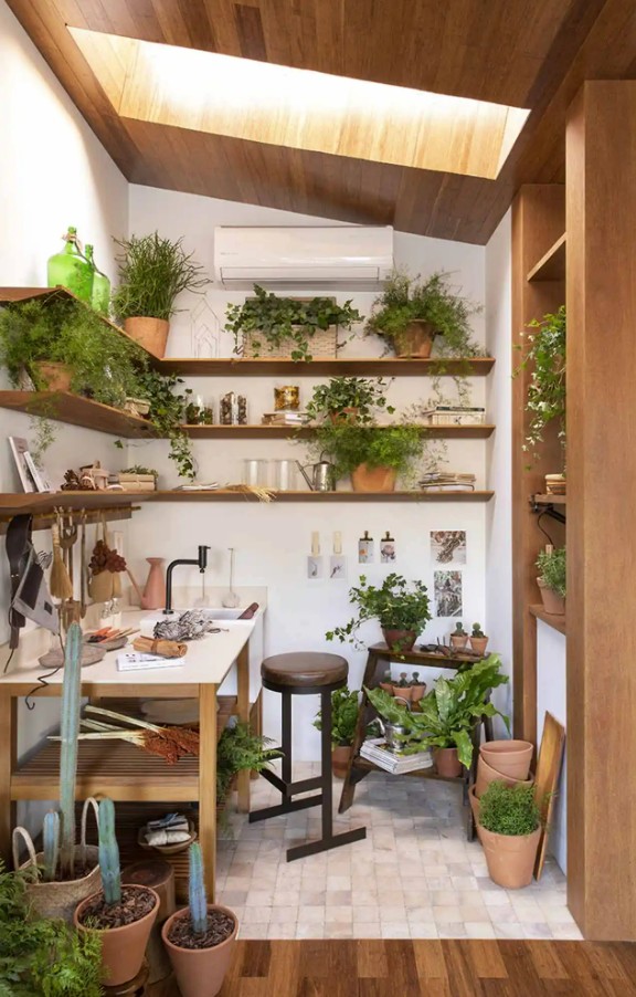 Depois de organizar itens essenciais, use prateleiras rústicas para exibir plantas, livros, quadros e objetos afetivos. Misture peças de tamanhos diferentes, alternando cores e texturas para criar equilíbrio visual. Espécies como jiboia e zamioculca são ideais para ambientes internos, pois trazem vida e frescor mesmo em áreas com pouca luz natural.