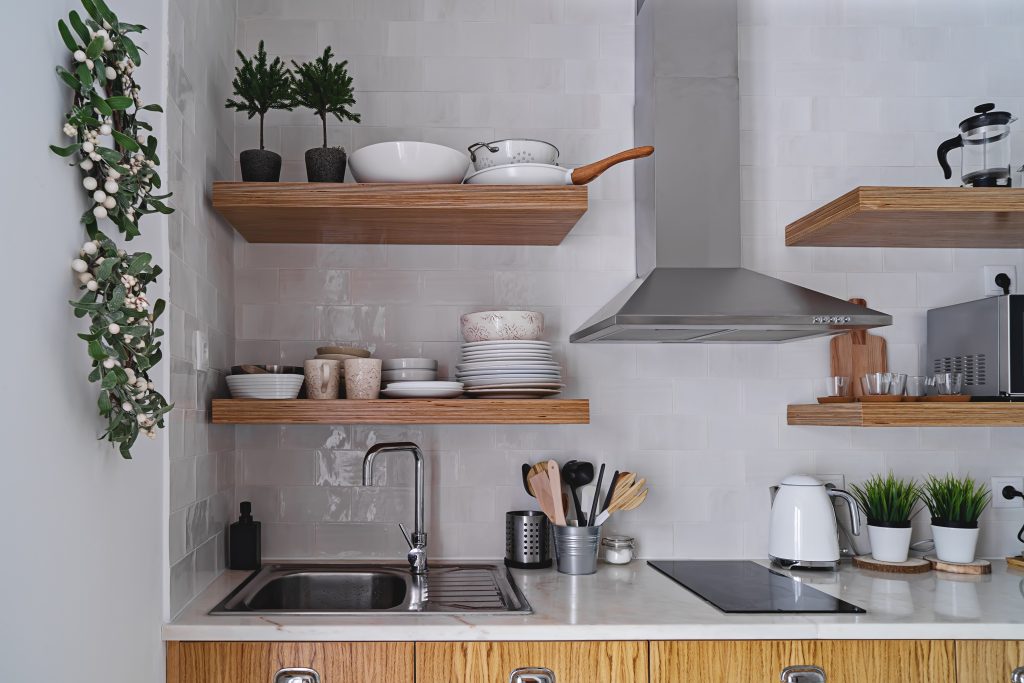 As prateleiras rústicas podem substituir armários aéreos, deixando a cozinha mais leve e funcional. Antes de instalar, meça os espaços destinados a utensílios e eletrodomésticos. Mantenha pelo menos 50 centímetros entre a bancada e a primeira prateleira para garantir conforto e evitar acidentes durante o preparo dos alimentos.