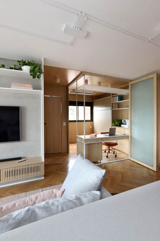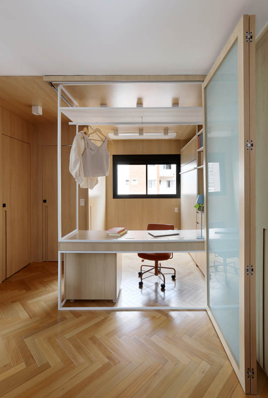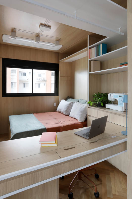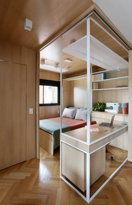 Quando usado como dormitório, há um sistema de portas/painéis em camarão que faz o fechamento mantendo o ambiente privado sem a interferência da área social.