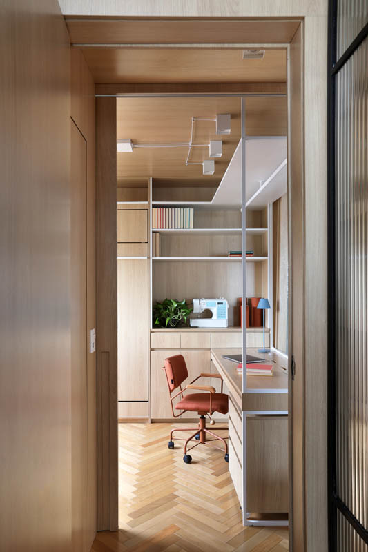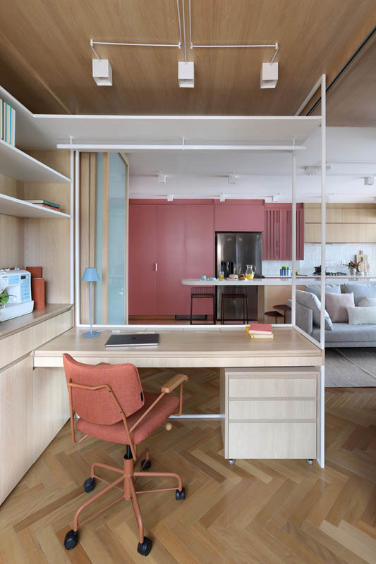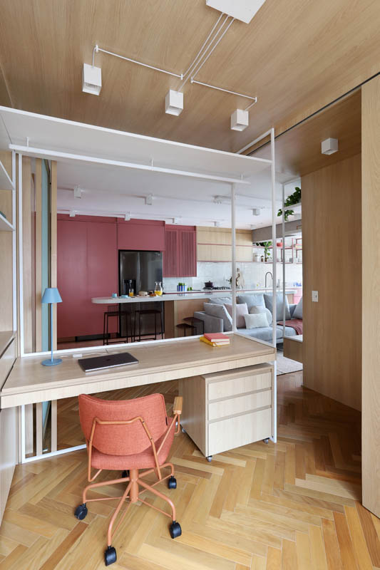 Há ainda uma cama de casal para receber hóspedes, porém, fica embutida na parede em um móvel também desenhado pelo escritório de arquitetura com acabamento em MDF Carvalho da Arauco, em um conjunto harmonioso com a bancada de trabalho.