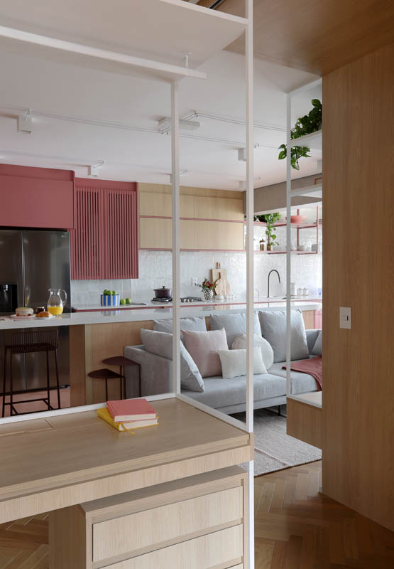 Studio 92 Arquitetura projetou espaço de apartamento integrando ambientes com funcionalidade e camuflagens para atender a diversas necessidades da morada: a receber bem com espaço à tranquilidade para trabalhar e criar coleções fashionistas