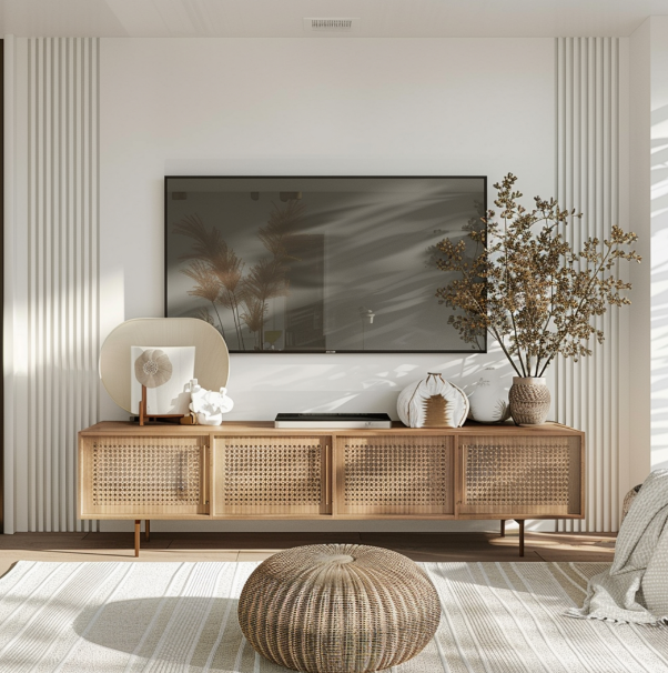 Sobre o rack, poucos itens bastam: um vaso de cerâmica em tom terroso, uma escultura pequena em madeira clara e alguns livros empilhados já formam uma composição equilibrada.