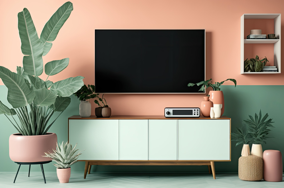 Em decorações com tons pastéis, um rack com detalhes coloridos se integra melhor à proposta. Por exemplo, uma gaveta em azul claro, uma porta em rosa suave ou puxadores em verde menta criam conexões visuais que amarram o ambiente sem pesar.