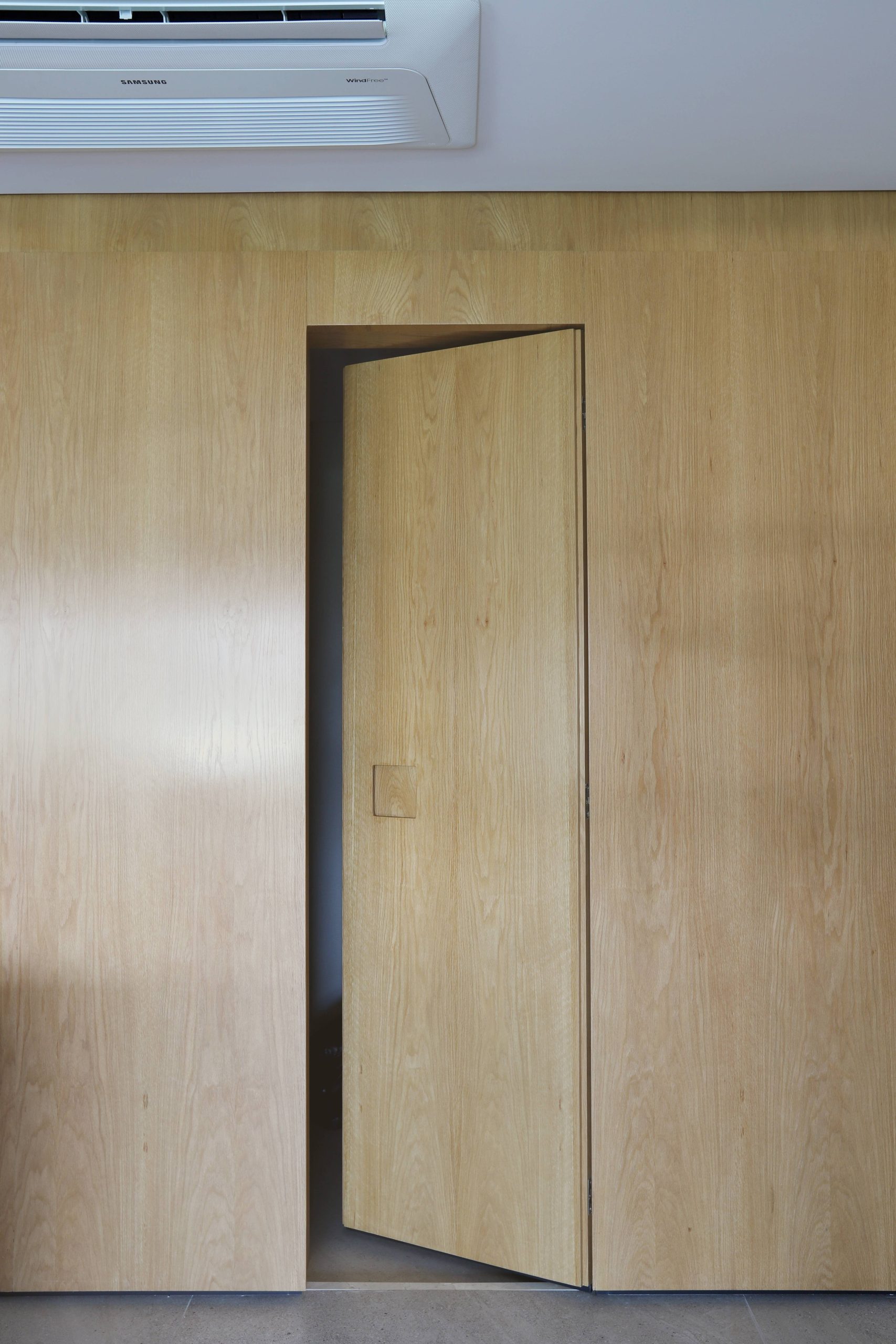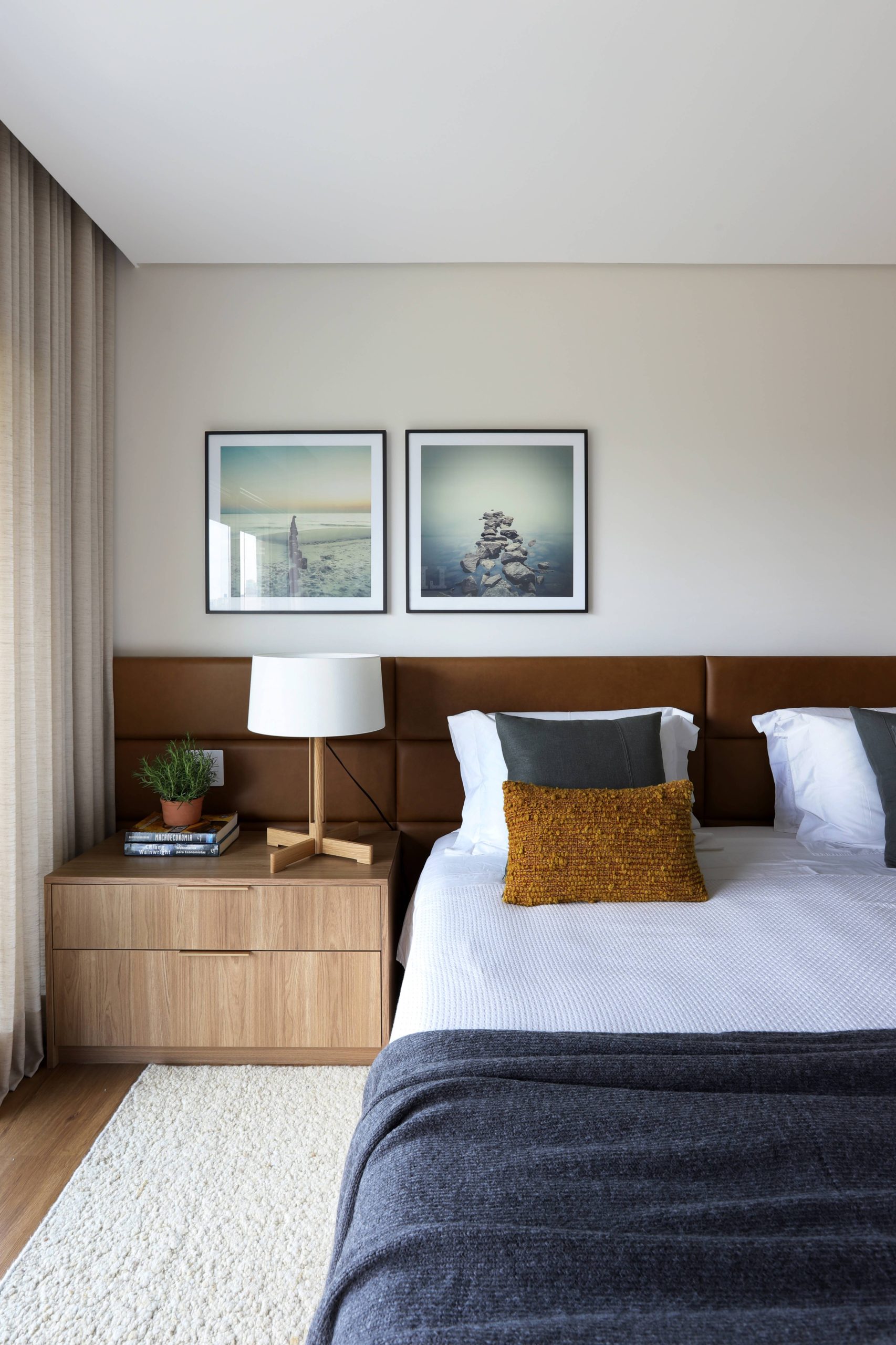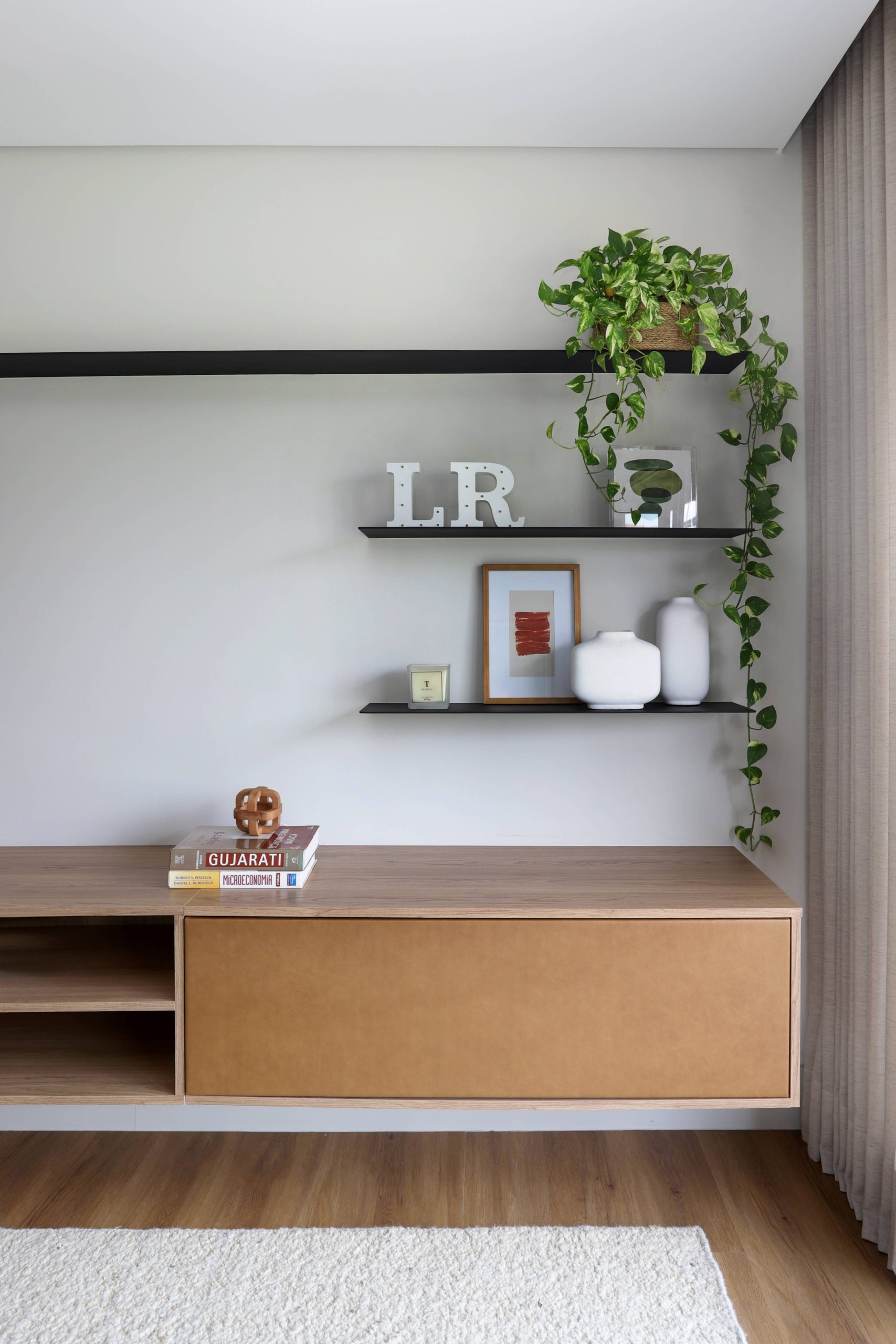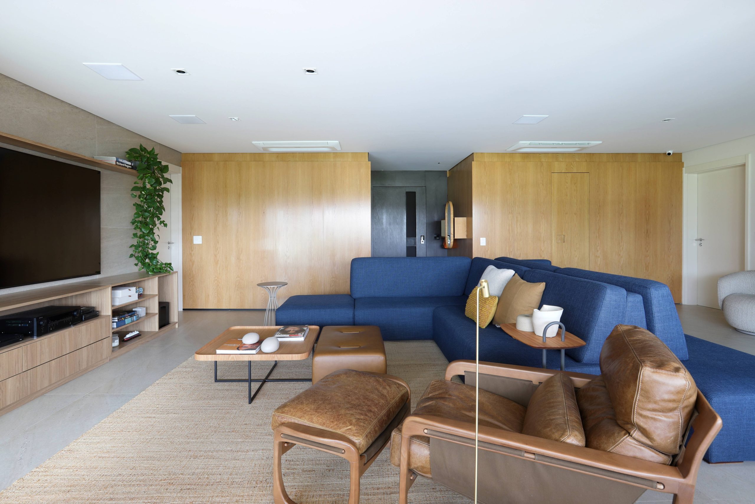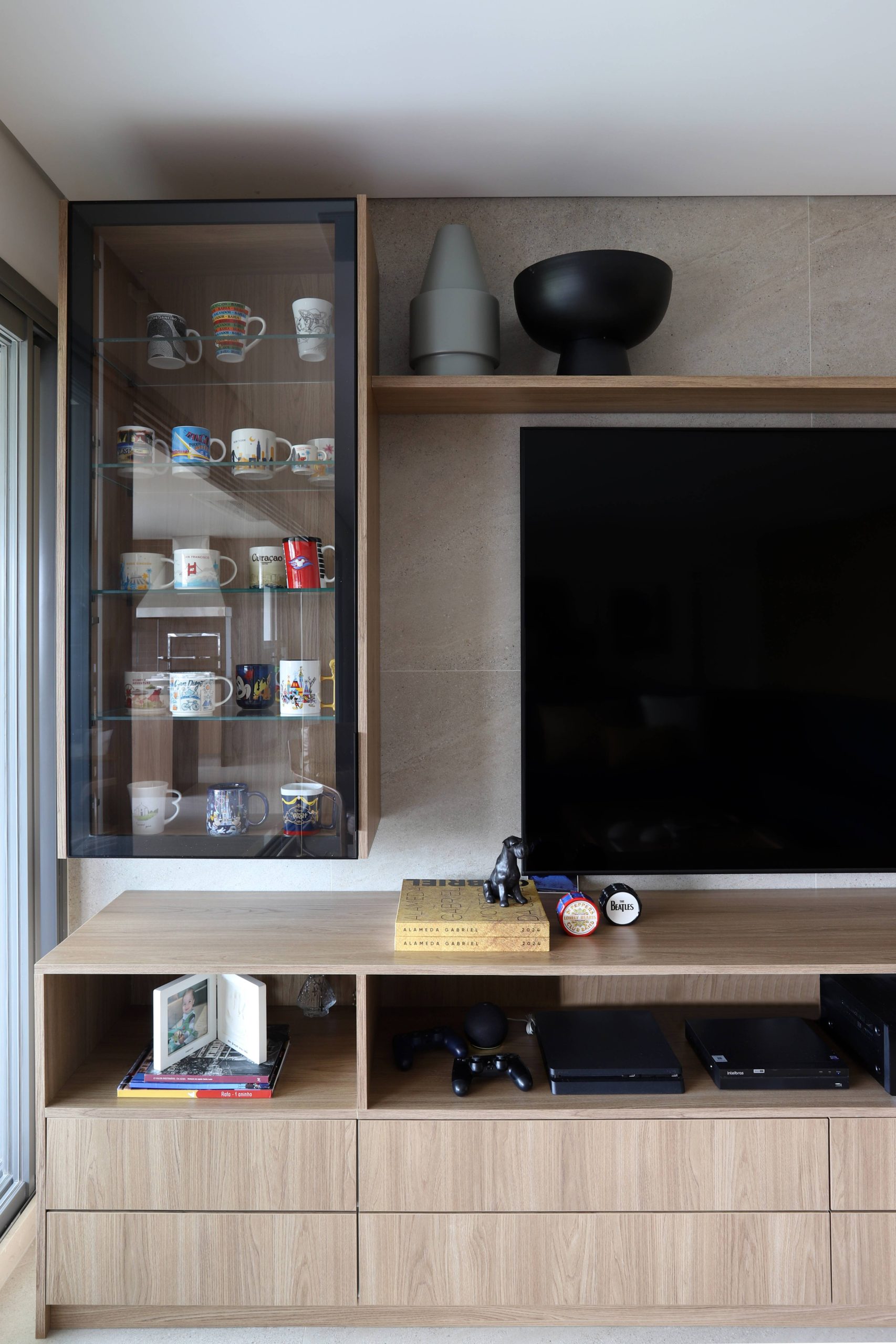 Com base neutra e atemporal, o apartamento conta com toques amadeirados em revestimentos e toques de cor, como o sofá azul da sala, dando um ar despojado ao projeto. A marcenaria é o grande destaque: além do painel de madeira clara, Marí Aní Oglouyan criou um móvel baixo com gavetas e nichos para guardar e organizar os equipamentos eletrônicos. E mais: a cristaleira com portas de vidro e prateleiras expõe de forma elegante objetos decorativos e as coleções de canecas, funcionando como ponto de interesse visual. A prateleira superior, mais discreta, dá leveza ao conjunto e acomoda peças de design e plantinhas.