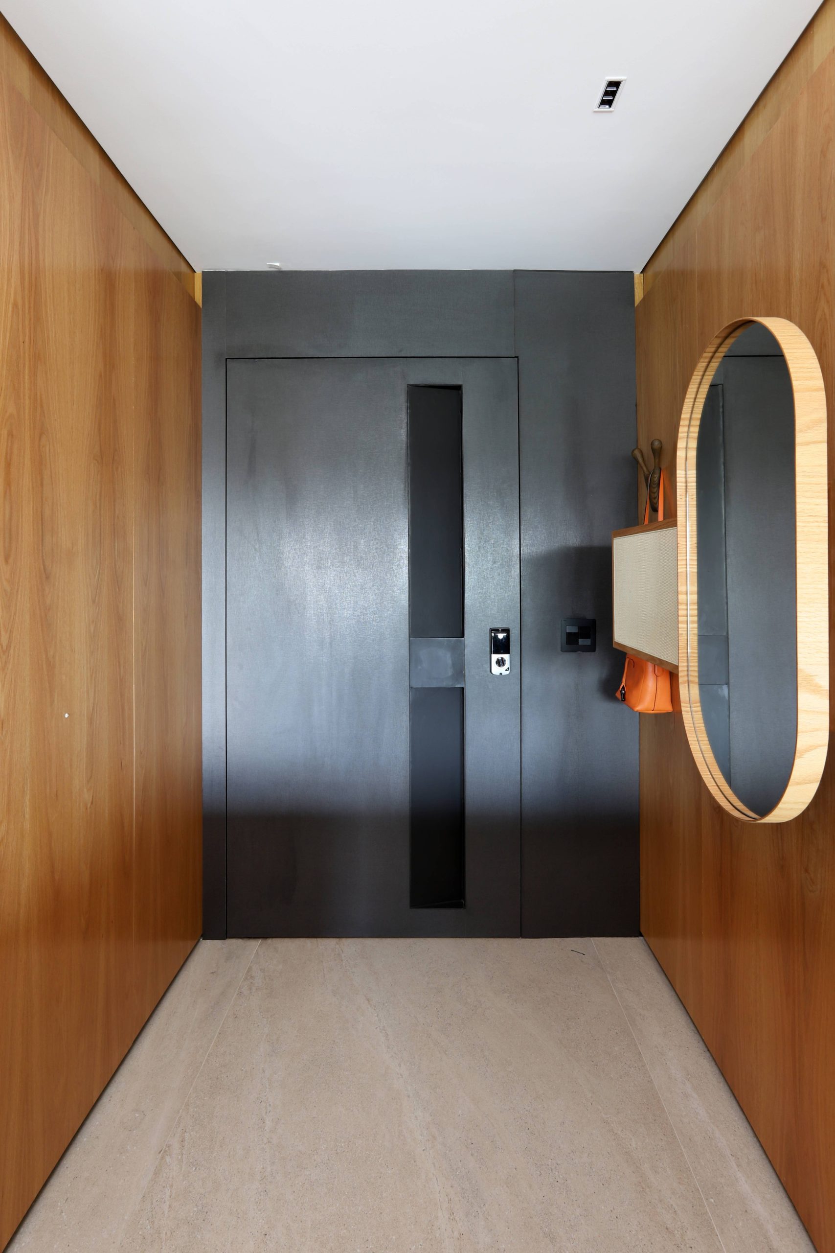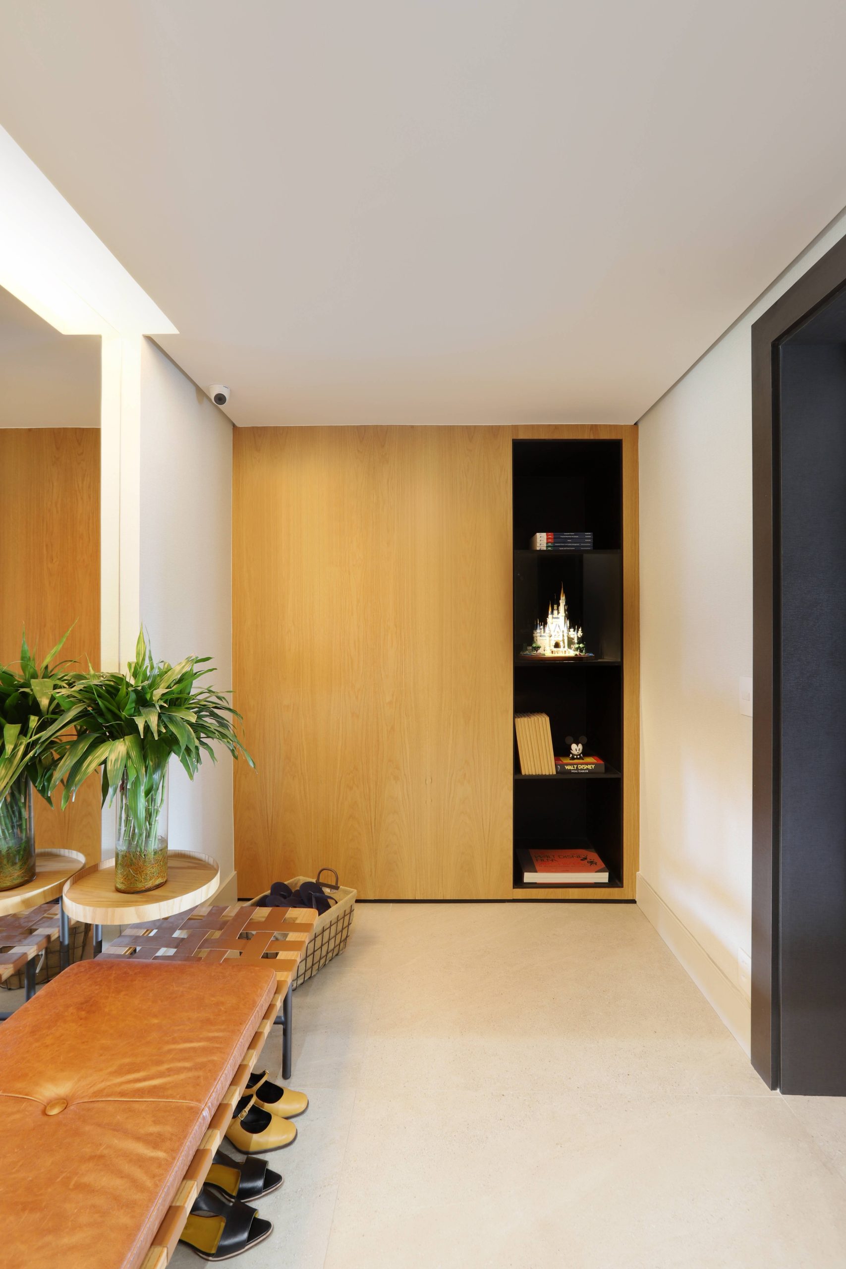 Quem chega ao apartamento é recebido no hall repleto de memórias afetivas, já que o armário executado pela SCA Jardim Europa foi encomendado sob medida para exibir a coleção da Disney dos moradores. Por ali, não poderia faltar um lugar para que os convidados possam se sentar e tirar os calçados. Logo após passar pela porta, um pequeno armário na parede faz às vezes de chapeleira, para pendurar bolsas, enquanto o espelho redondo possibilita dar uma espiada no look antes de sair de casa.