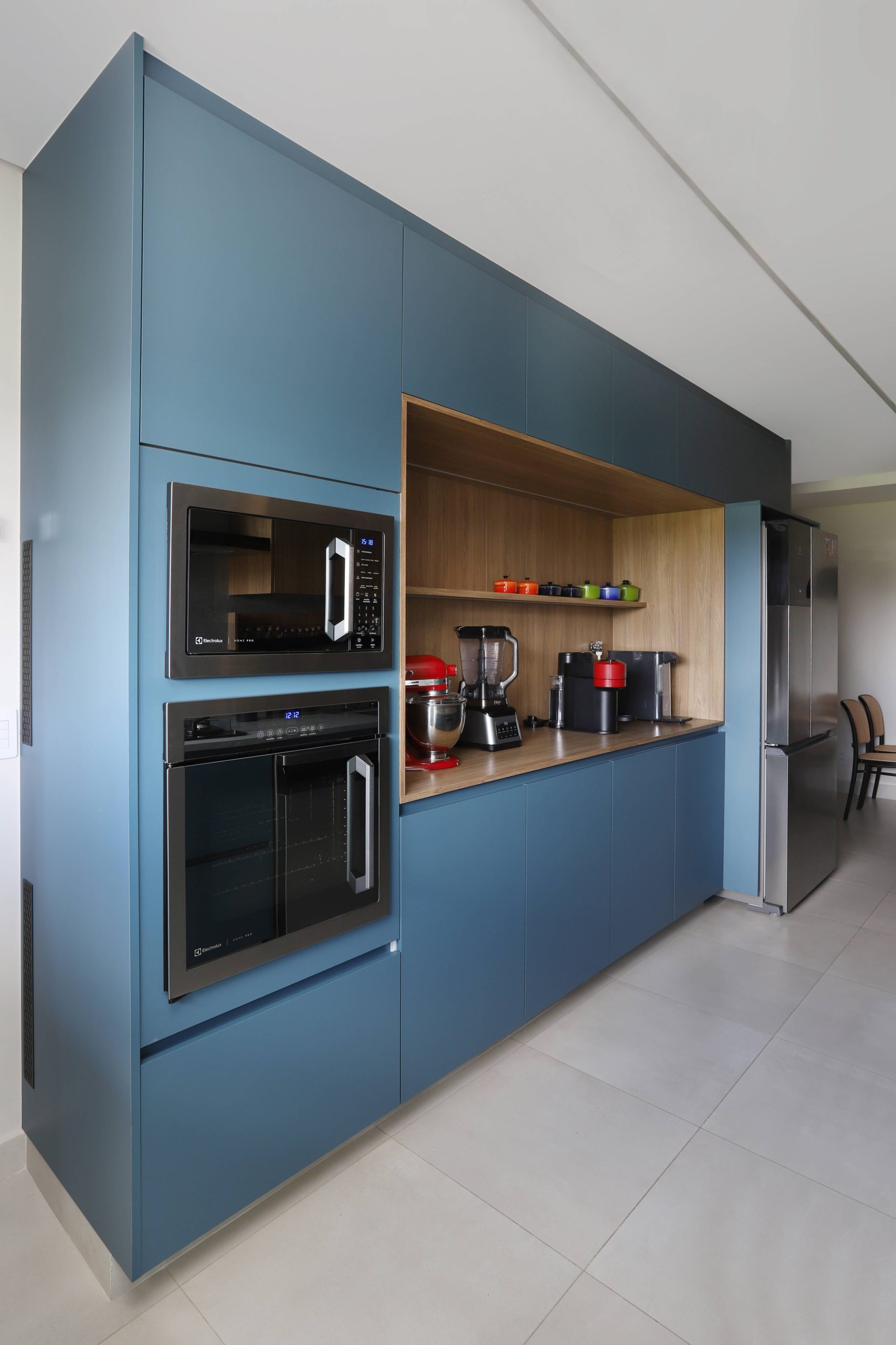 A cozinha da família foi projetada de maneira prática e elegante, com a marcenaria desempenhando papel central na organização do ambiente. Com dois acabamentos – azul e amadeirado, o mobiliário ganha um contraste equilibrado. O azul traz personalidade e frescor, enquanto a madeira aquece o espaço, deixando tudo mais acolhedor. A disposição linear da marcenaria, em armários superiores e inferiores, garante bastante espaço de armazenamento e contribui para a sensação de ordem.
