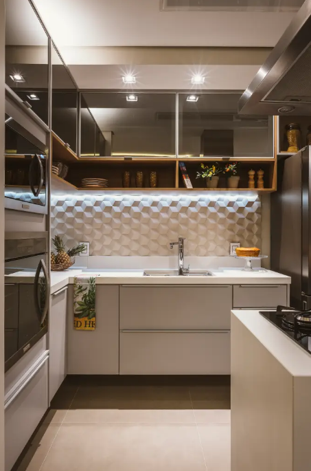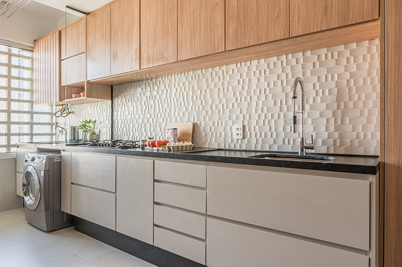 A parede atrás da bancada ou do fogão é o ponto mais indicado para o revestimento 3D na cozinha, porque concentra boa parte da rotina. Como o ambiente exige limpeza frequente, cerâmica e porcelanato trazem mais segurança. Com esse cuidado no lugar, a parede passa a ter textura e presença na composição sem perder a praticidade.