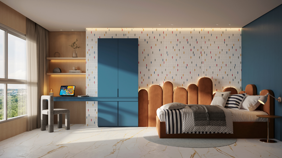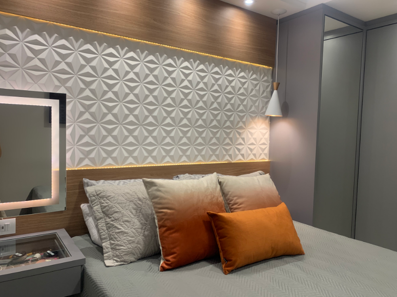 A parede da cabeceira é o destino mais comum do revestimento 3D no quarto, justamente por ser o ponto focal natural do ambiente. Uma iluminação bem posicionada potencializa os relevos e amplia o efeito visual. Para quem quer ir além, cobrir uma parede inteira é uma forma de dar mais personalidade ao projeto.