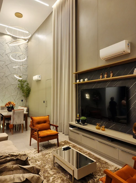 Por ser o primeiro contato com o imóvel, o hall de entrada define o tom da casa logo na chegada. O revestimento 3D potencializa essa experiência com profundidade e destaque imediato. Quando cores e materiais dialogam com o restante da casa, a passagem entre os cômodos fica muito mais fluida.