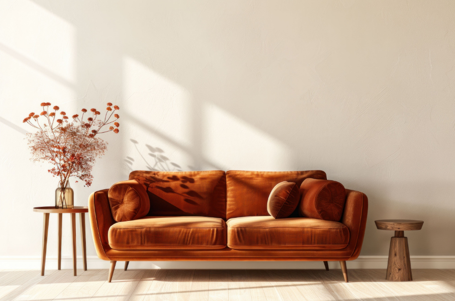 Uma combinação que agrada bastante é o sofá em tom quente com paredes neutras e papel de parede geométrico. Ambientes muito frios ou com excesso de branco tendem a enfraquecer a presença do móvel, então equilibrar os elementos do espaço faz toda a diferença.